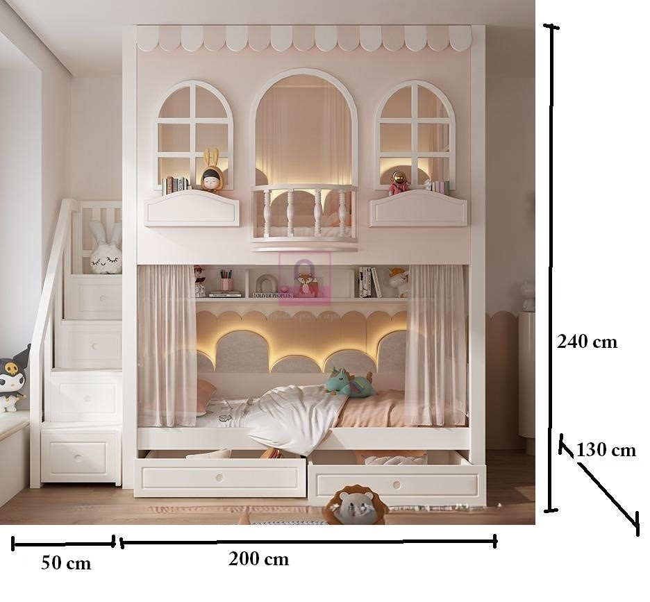 Accesul la patul de sus se face utilizand dulapul tip scară, iar pentru protecția copiilor, patul este dotat cu uși glisante. Salteaua necesară patului superior trebuie sa aibă dimensiunile de 120/190 cm si o grosime de 14-17 cm.