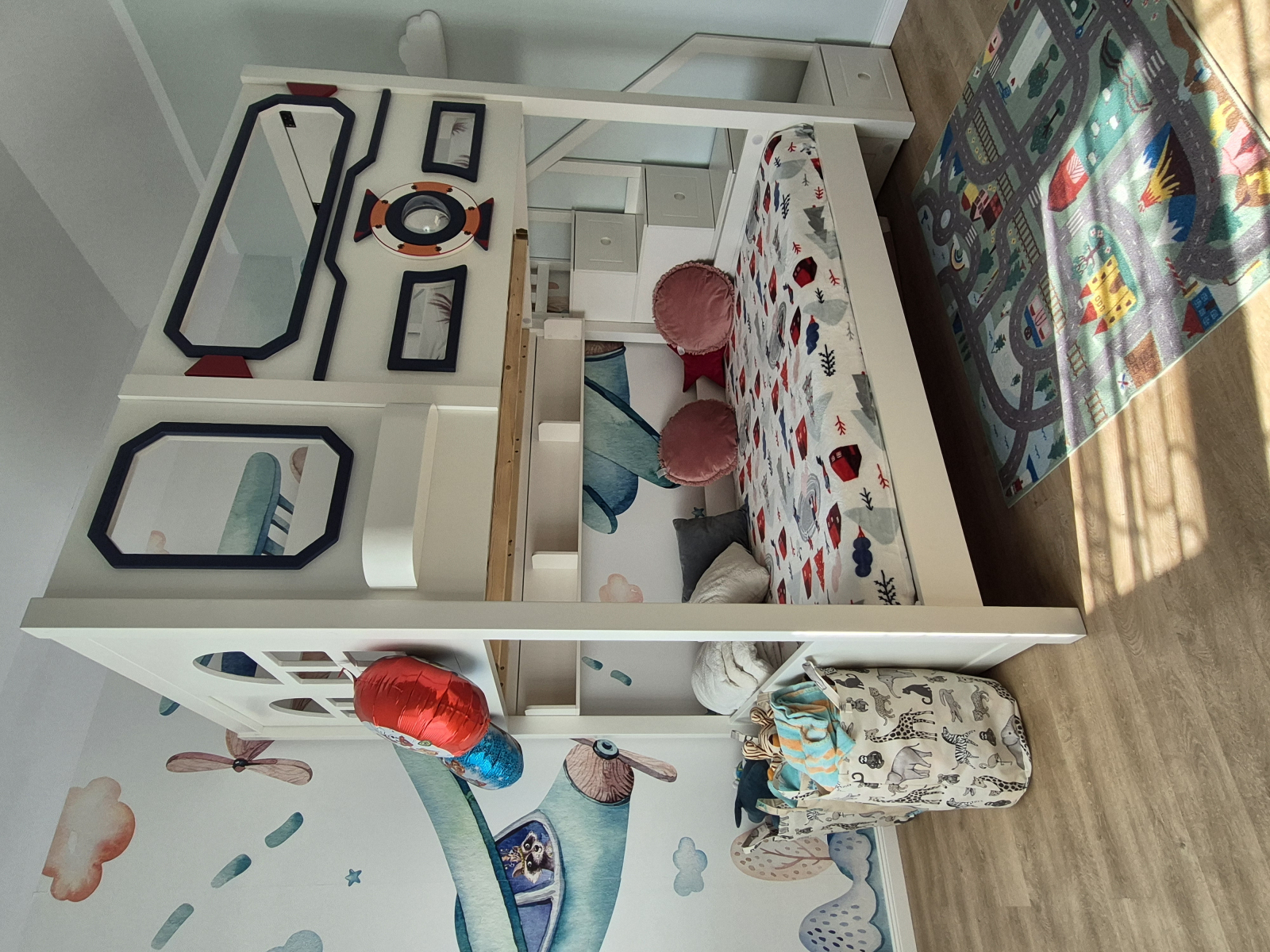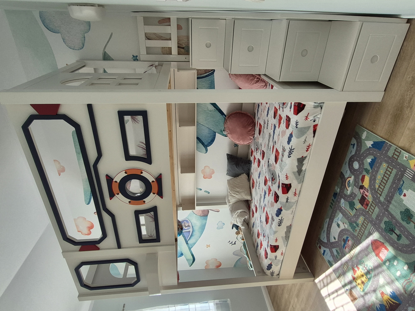 Un pat solid,frumos si rezistent. Este mare si e nevoie de o camera inalta si spatioasa. Arata mai bine decat in poze. Baietii nostri sunt foarte incantati de patul lor naveta spatiala,iar noi suntem multumiti ca e cu protectie inalta si usi culisante.