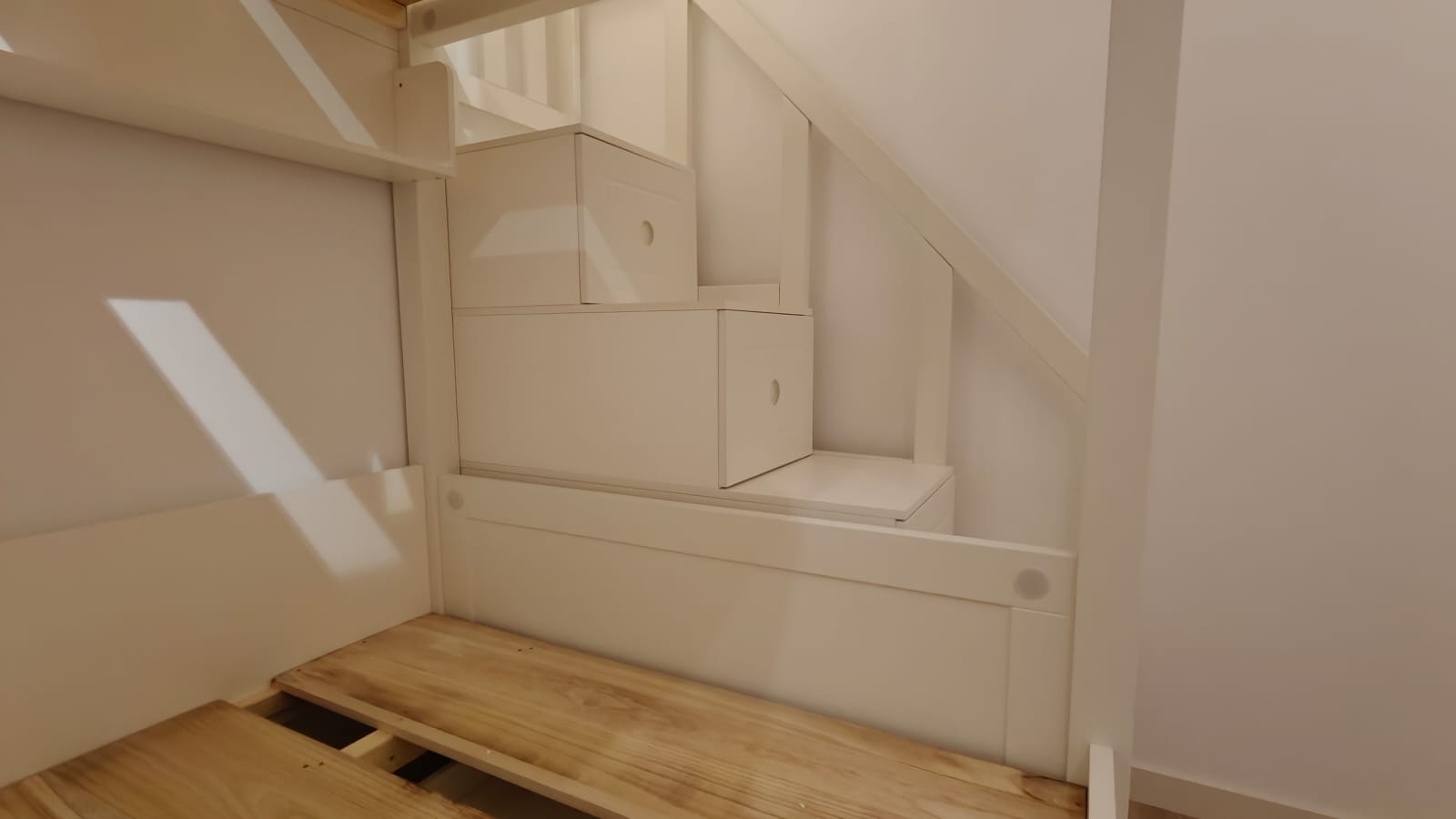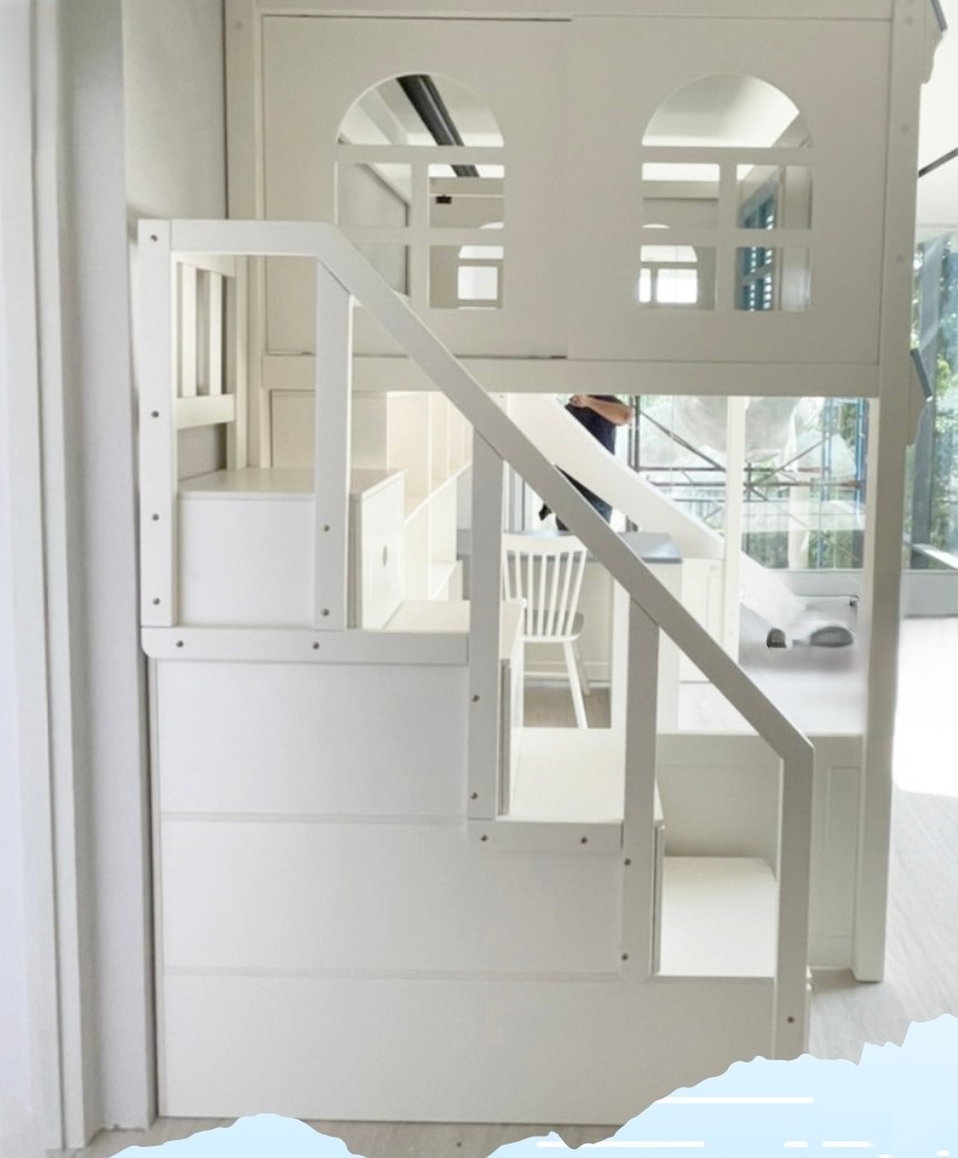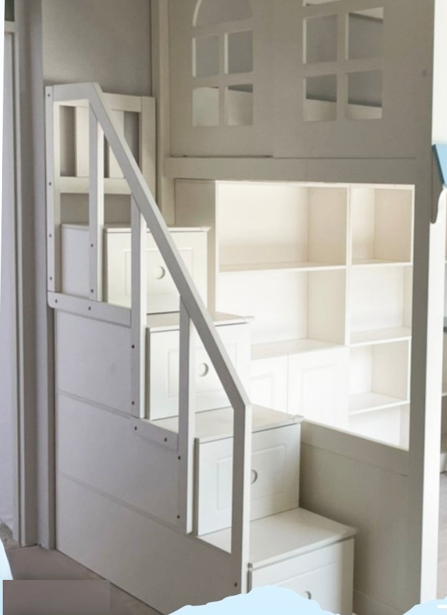 Accesul la patul de sus se face utilizand dulapul tip scară, iar pentru protecția copiilor, patul este dotat cu uși glisante. Salteaua necesară patului superior trebuie sa aibă dimensiunile de 120/190 cm si o grosime de 14-17 cm.