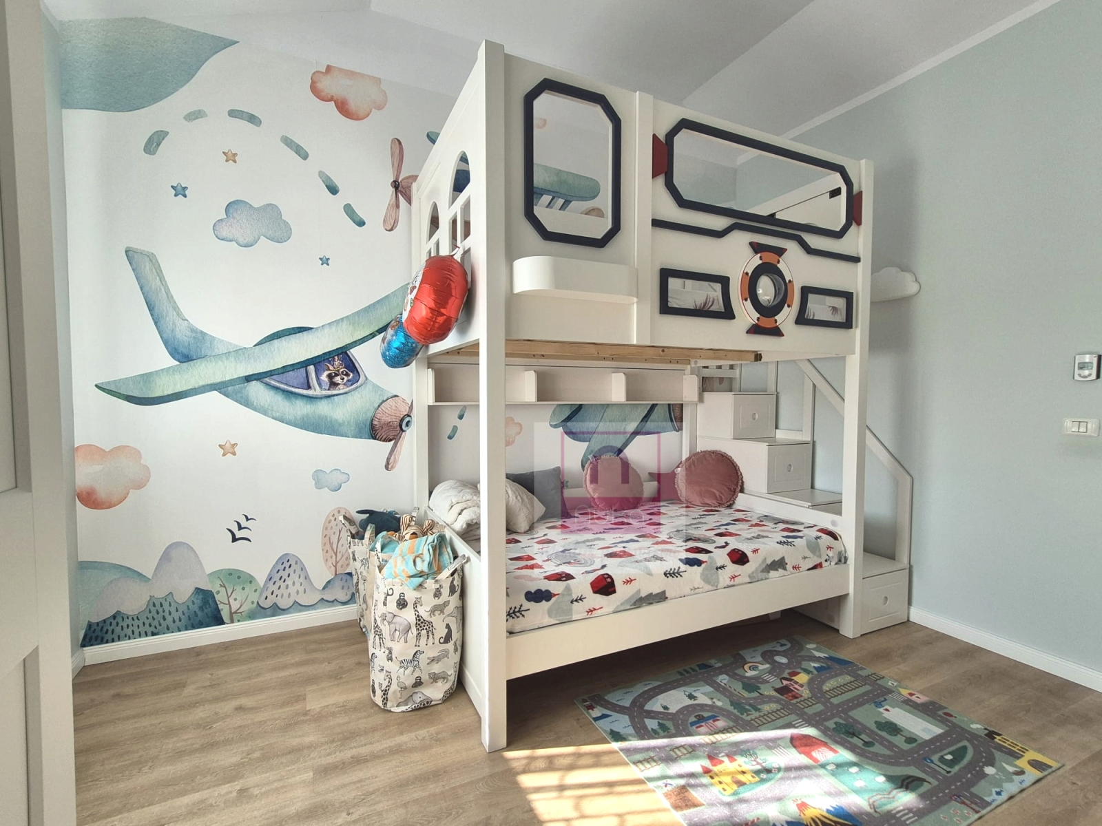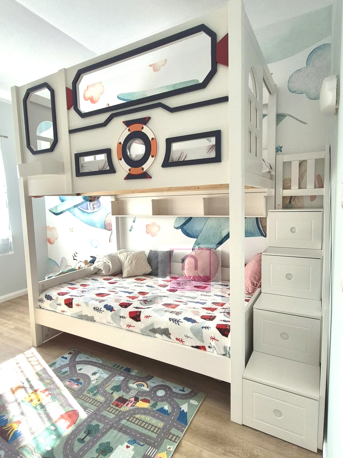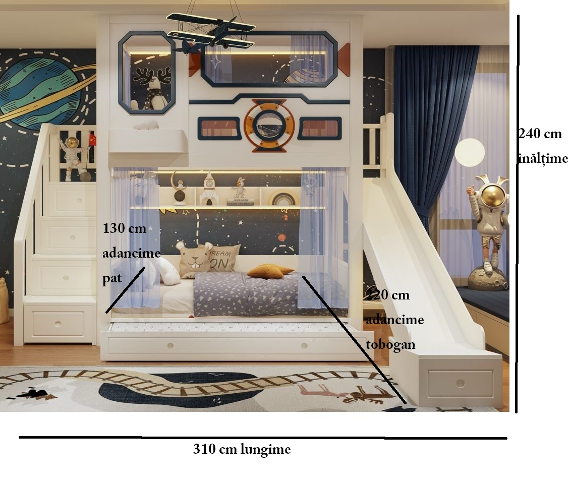Un pat solid,frumos si rezistent. Este mare si e nevoie de o camera inalta si spatioasa. Arata mai bine decat in poze. Baietii nostri sunt foarte incantati de patul lor naveta spatiala,iar noi suntem multumiti ca e cu protectie inalta si usi culisant...